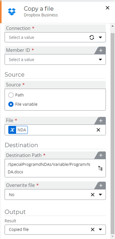 View example Both a file variable and a file path are used in the example image below for the Dropbox Business - Copy a file action. A file variable is selected for Source and a file path is specified for Destination.